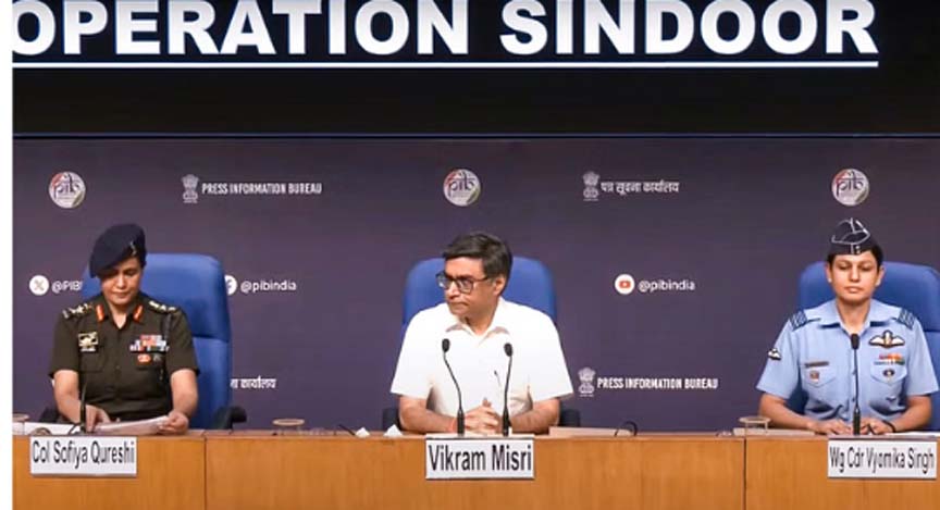 नई दिल्ली 07 मई 2025। सरकार और सेना ने पाकिस्तान और पाकिस्तान के अवैध कब्जे वाले कश्मीर में भारतीय सशस्त्र बलों की स्ट्राइक ‘ऑपरेशन सिंदूर’ के बाद एक प्रेस कॉन्फ्रेंस की। इस दौरान प्रेस कॉन्फ्रेंस को संबोधित करने के लिए कर्नल सोफिया कुरैशी और विंग कमांडर व्योमिका सिंह मौजूद थीं। प्रेस कॉन्फ्रेंस में संसद हमले, मुंबई हमले, पुलवामा हमले और पहलगाम हमले के दृश्य दिखाए गए। सबसे पहले विदेश सचिव विक्रम मिस्री ने प्रेस कॉन्फ्रेंस को संबोधित किया। इसके बाद कर्नल सोफिया कुरैशी और विंग कमांडर व्योमिका सिंह ने ‘ऑपरेशन सिंदूर’ की पूरी जानकारी साझा की। उन्होंने बतायास कि ऑपरेशन सिंदूर 22 अप्रैल को पहलगाम में हुए वीभत्स आतंकी हमले के शिकार नागरिकों और उनके परिवारों को न्याय देने के लिए किया गया। नौ ठिकानों की पहचान कर उन्हें बर्बाद किया गया। इन ठिकानों में आतंकियों को प्रशिक्षित किया जाता था। ये आतंकियों के लॉन्च पैड थे। ऑपरेशन सिंदूर के लिए इन लक्ष्यों का चयन विश्वसनीय खुफिया सूचनाओं के आधार पर हुआ। इसमें यह ध्यान रखा गया कि रिहाइशी इलाकों और आम नागरिकों को नुकसान न पहुंचे।